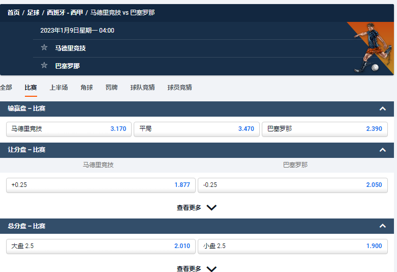 马德里竞技 vs 巴塞罗那,来自平博的西甲赔率盘口