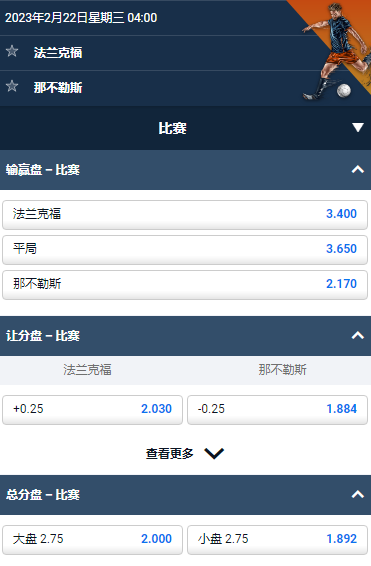 欧冠,法兰克福将于2月22日04:00迎战那不勒斯,那不勒斯本赛季表现出色,在欧冠小组中排名第一。平博的赔率2.17也倾向于那不勒斯,而法兰克福为3.4,平局3.65。法兰克福在欧冠主场表现并不稳定,目前一胜一负一平。我们预测那不勒斯客场获胜。