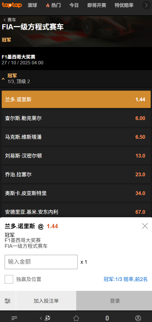 - 稳健型:维斯塔潘夺冠(2.50)或迈凯伦夺冠(2.10)二选一,结合排位后再做微调。