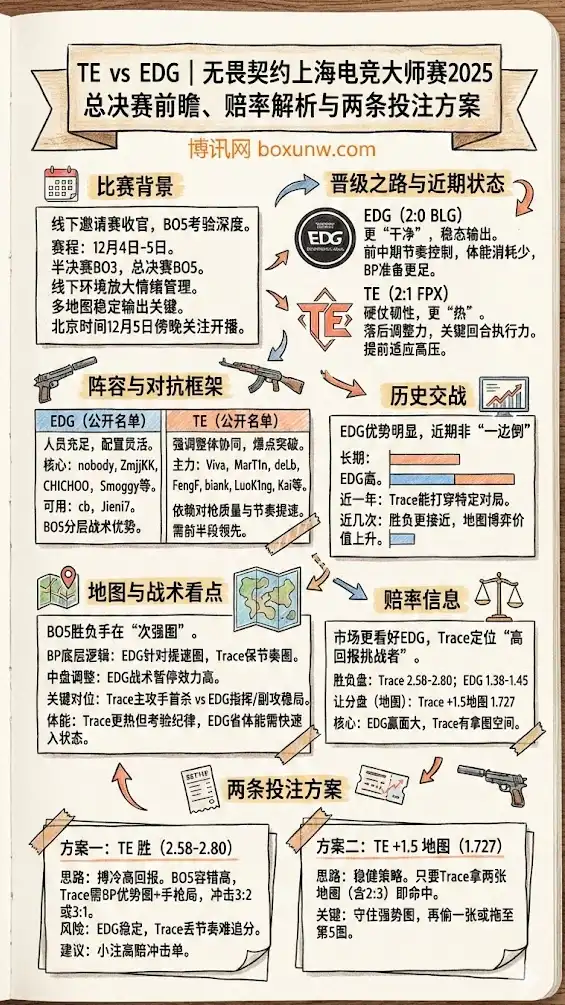 无畏契约上海电竞大师赛2025进入最后一战:TE与EDward Gaming(EDG)会师总决赛,赛制为BO5。对于两支同属VCT CN体系的队伍来说,这不仅是线下舞台的荣誉之争,也是对阵容磨合、地图池与临场应变的一次“压轴测验”。从半决赛晋级路径、历史交锋到盘口态度,本场更像一场“熟人局里的硬碰硬”。