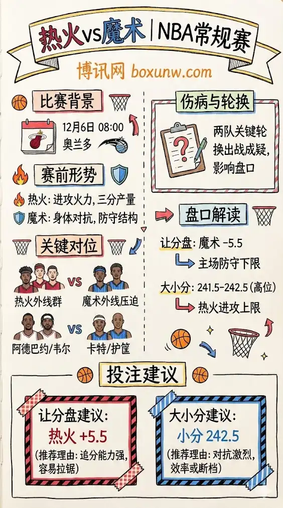 北京时间12月6日08:00,迈阿密热火客场挑战奥兰多魔术。两队同属东南赛区,赛程进入12月后强强对话增多,而双方下周还将继续在奥兰多交手(杯赛节点临近),这场常规赛的对抗强度与战术试探意味都会更浓。