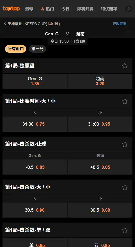 - 胜负(全场):Gen.G约 1.20–1.32;越南约 2.90–4.33