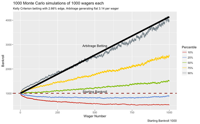 1000个蒙特卡洛模拟的平均值产生了约500个单位的利润。前10%产生约3,000个单位的利润,这是在娱乐场最好的情况,而后10%造成约500个单位的损失。在1,000多次投注中,套利投注的表现与蒙特卡洛模拟的前10%相当,如本文所重申的,其不含差异。