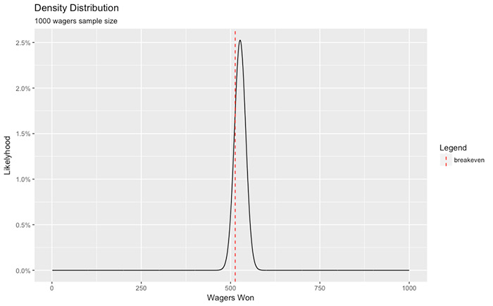 使用赔率为1.95的1,000个投注作为样本,相当于赢得了512.8个投注(见下图)。这告诉我们,基于二项分布,具有给定优势的512次或更少的投注成功的概率是18.6%。具有给定优势的450次或更少的投注成功的概率是4.91%。