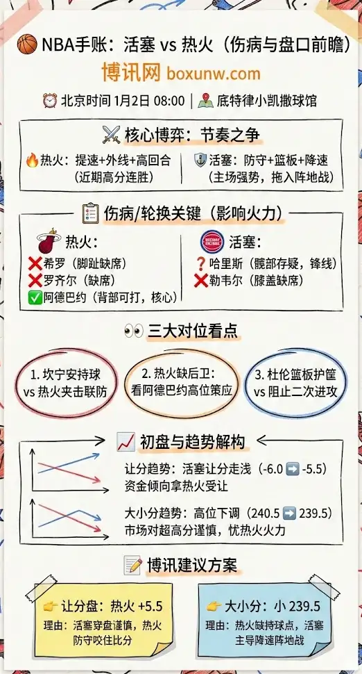 北京时间1月2日08:00(底特律当地时间1月1日19:00),底特律活塞坐镇小凯撒球馆迎战迈阿密热火。活塞本季主场表现强势,热火则带着连胜与高热状态北上,比赛看点集中在“节奏能否被活塞拖慢”以及“热火后场伤病对火力的影响”。