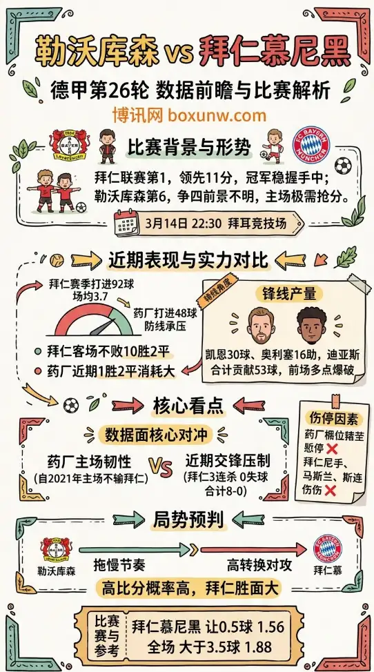 北京时间3月14日22:30,德甲第26轮迎来重头戏,勒沃库森坐镇拜耳竞技场对阵拜仁慕尼黑。单看排名,这不是榜首大战,但比赛分量非常足。拜仁25轮拿到66分,联赛只输1场,已经把与第二名的差距拉开到11分,冠军主动权牢牢握在自己手里。勒沃库森25轮44分排在第6位,距离欧冠区并不宽裕,这一轮主场抢分价值极高。