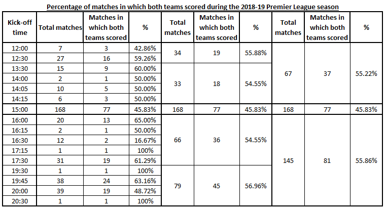 在最常见的周六15:00开赛的比赛中,只有45.83%发生了两队都得分的情况,大大低于联赛总值51.32% 反而是那些不在这个时间开赛的比赛拉高了联赛总值——在这之前开赛的67场比赛的两队都得分概率为55.22%,在这之后开赛的145场比赛则为55.86%。