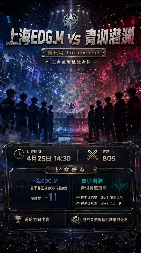 这场比赛是2026王者荣耀挑战者杯第一阶段首轮对决,赛制为BO5,输了直接出局,容错空间非常小。对上海EDG.M来说,这是春季赛结束后的第一场杯赛,也是重新证明KPL席位含金量的机会;对青训潜渊来说,这一战则是青训赛道冠军向职业队正面叫板的最好舞台。更关键的是,挑战者杯首阶段存在“挑战者的祝福”机制,青训潜渊作为低一级赛道队伍,打上海EDG.M这种KPL队时,战术层面天然多一张牌,比赛悬念并不低。