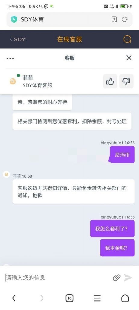 本来没想玩,要打三倍流水容易输光,推广说给申请到两倍,我才同意玩的,结果存进去之后打了半天,提款才知道还是三倍,现实玩的电子输了一千,然后打竞速彩票赢回来了,差一点输光,然后提款失败,推广说注单有问题,说什么我和别的账号竞速彩票同时下注,要审核,审核2-7天,大家想想,这是人能编出来的理由?竞速彩票和电子一样,投注才会开奖,别人和我开的又不一样,我说过几天联系不到你怎么办,他说不会,结果今天直接消失,今天是第二天,账号直接封了,本金也吃