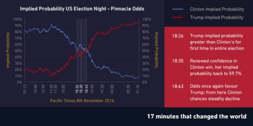 在2016年之前,唐纳德·特朗普什么时候会举行最后一次总统竞选活动,或者英国人何时被要求决定是否要脱欧,答案无人知晓。的确。正因如此,正常规则不适用于政治博彩。下图根据平博的赔率分析了特朗普和克林顿赢得2016年美国大选的隐含概率,表明实践是真正的检验。