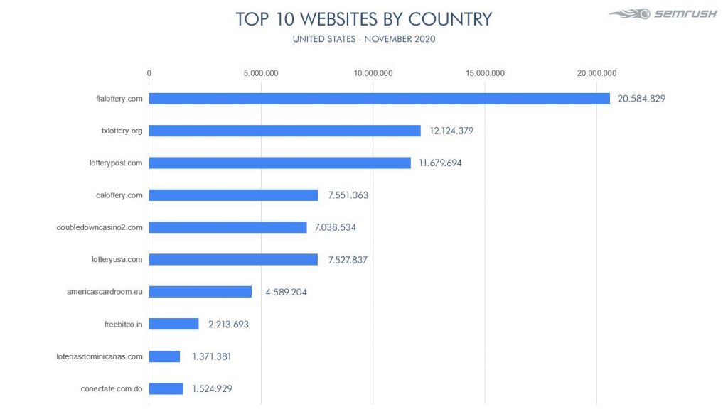 11月美国地区数据显示,领先的佛罗里达州彩票(flalottery.com)与10月相比下降了7.2%,拥有2058万用户。紧随其后的是德克萨斯州彩票(txlottery.org),与上个月持平,为1,212万。彩票邮政(lotterypost.com)位居第三,拥有1167万用户,每月增长4.6%。
