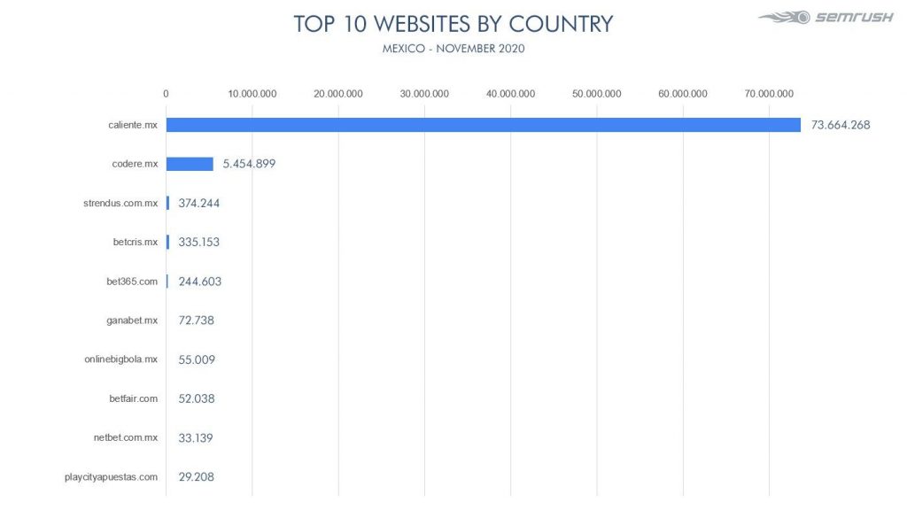 在墨西哥,尽管10月份下降了16.5%,但Caliente.mx轻松获得了7366万用户的第一名。Codere.mx下降了4%,虽然排名很远,但排名第二,为545万,而strendus.com.mx以374,244位用户排名第三,下降了9.4%。