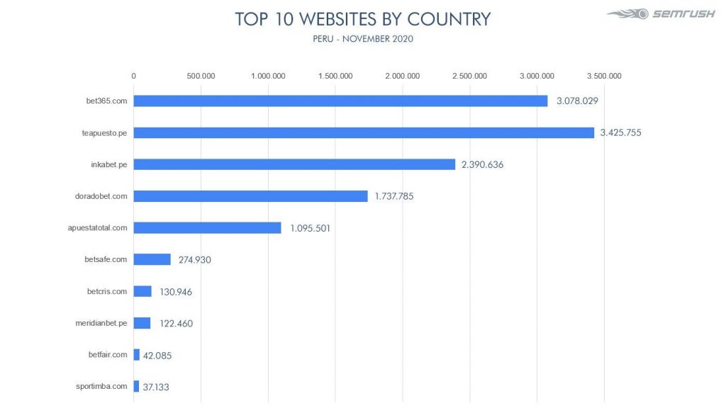 在秘鲁,bet365在11月份再次以30,029,029名用户领先,与10月份持平。紧随其后的是teapuesto.pe,下跌2.1%,至224万。Inkabet.pe以223万名用户排名第三。