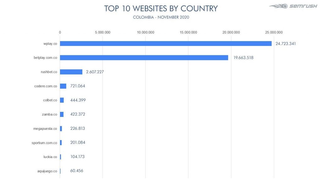 哥伦比亚的在线赌博流量排名使Wplay.co排名第一,拥有24,723,341名用户,比10月份下降了10.7%。其次是betplay.com.co,该网站下降了将近28%,托管了1,966万人。紧随其后的是rushbet.co,仅260万,下降了近7%。