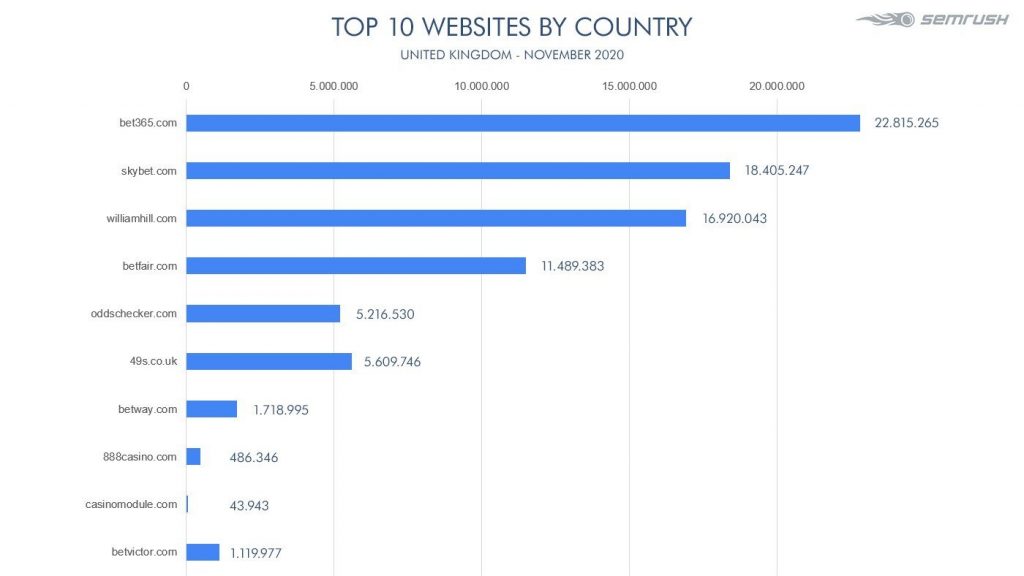 与前一个月相比,英国按流量排名前三的赌博网站呈现出积极的趋势。Bet365以2281万用户的身份再次名列榜首,增长5.3%。Skybet以1,840万名列第二,增长8.5%。威廉·希尔(William Hill)排名第三,拥有1692万用户,每月增长6.2%。