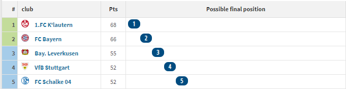 然而,他们以 1-0 的比分战胜了拜仁慕尼黑,并继续以 6 分的优势位居积分榜榜首。这是德甲最令人印象深刻的冠军胜利之一,他们以 81 分打破了积分记录,本赛季 34 场比赛的 25 场胜利贡献了 73.5% 的胜率。