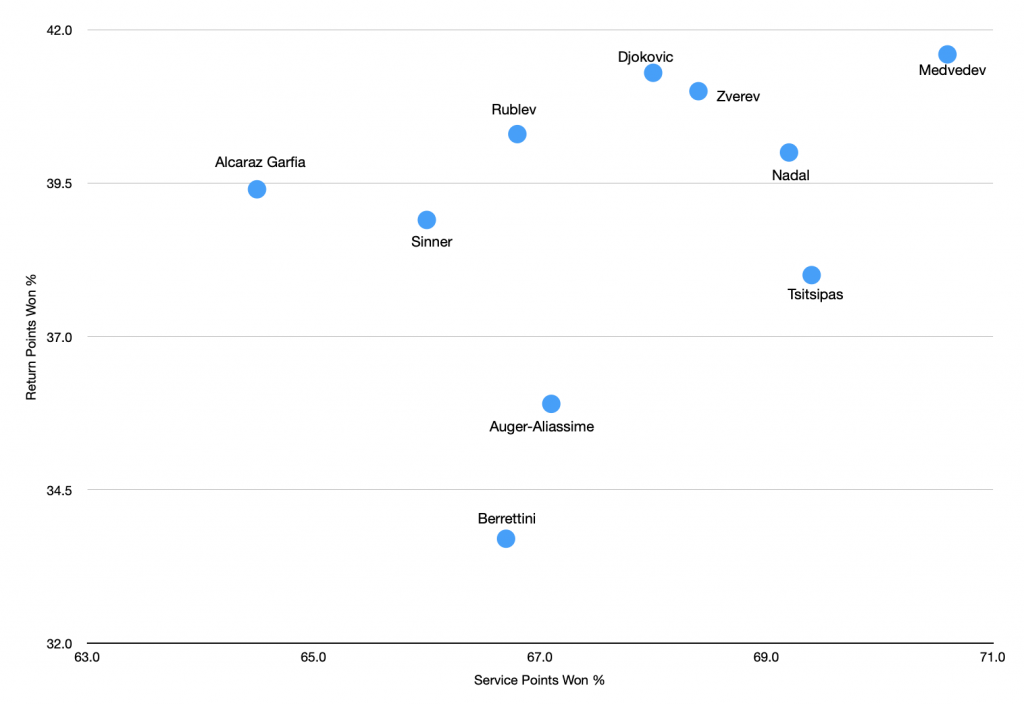 Andrey Rublev 和 Stefanos Tsitsipas 似乎也有一个明确的“第二梯队”,或许还有 Jannik Sinner(他肯定有优势,至少可以突破到精英阶层)显然适合下一个梯队。 上图显示,与最好的球员相比,鲁布列夫的发球数并不引人注目,而西西帕斯的回球能力阻碍了他晋级精英级别。