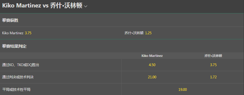 在平博,沃灵顿本周末以1.289 获胜,考虑到他在 2017 年击败马丁内斯,这并不令人意外。
