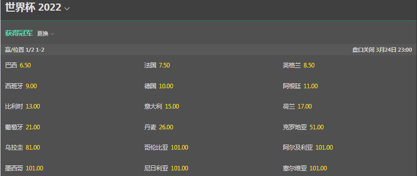 墨西哥和尼日利亚的赔率为 100/1,塞内加尔的赔率为150/1。