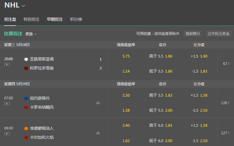冰球NHL赔率盘口,pinnacle平博和bet365中国赔率。在周六的7 场比赛中,三支球队在周日的比赛中,纽约游骑兵队和卡尔加里火焰队都需要加时赛来决定胜负,现在已经确认晋级季后赛第二轮的八支球队。