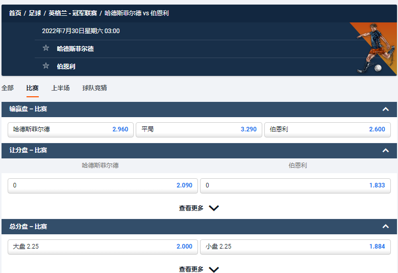2022-23赛季英冠的首场比赛,哈德斯菲尔德 vs 伯恩利,盘口赔率来自平博