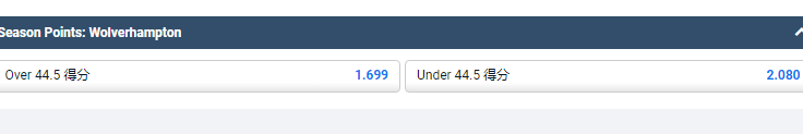 平博的英超进球大小盘显示,狼队本赛季进球的盘口为44.5