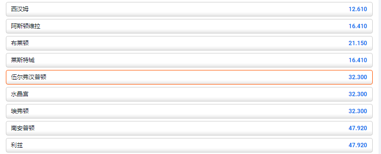 狼队在英超联赛的四个赛季中的三个赛季中都获得了上半段的成绩,他们可以在 2022/23 赛季以32.3的赔率进入英超前四名。