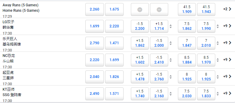 韩国棒球联赛KBO的盘口和赔率,数据来自于平博体育pinnacle