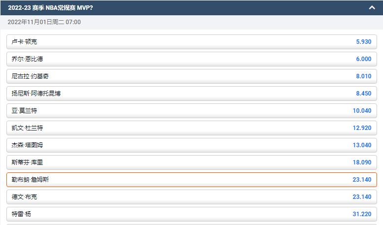 平博的盘口显示,詹姆斯获得2022-23NBA常规赛MVP的赔率为23.14