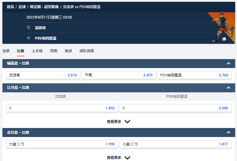 欧冠联赛,流浪者 vs PSV埃因霍温的盘口和赔率,盘口来自于平博体育pinnacle