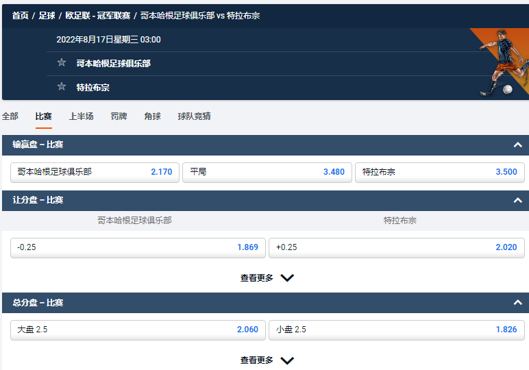 欧冠比赛,哥本哈根足球俱乐部 vs 特拉布宗的赔率,盘口数据来自于平博体育pinnacle
