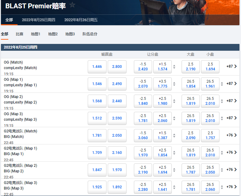CS:GO ESL挑战者联赛欧洲区的赔率,盘口数据来自于平博pinnacle