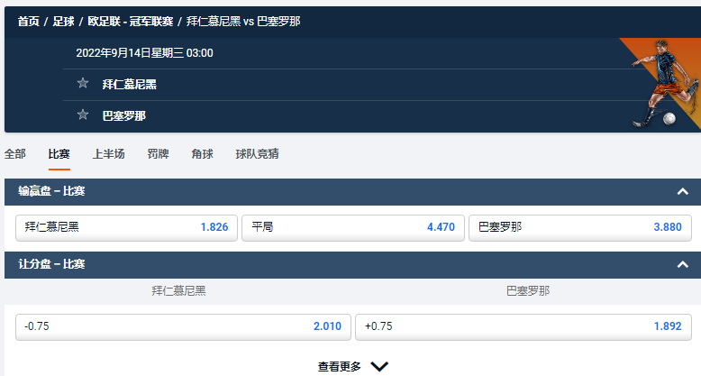 同时,小组赛的另一场比赛在17:45进行,国米将前往捷克球队比尔森,后者上周5-1输给了巴萨。国米在对阵拜仁的比赛中获胜的赔率为0.56,平局的赔率为3.67,维克托利亚获胜的赔率为7.00。